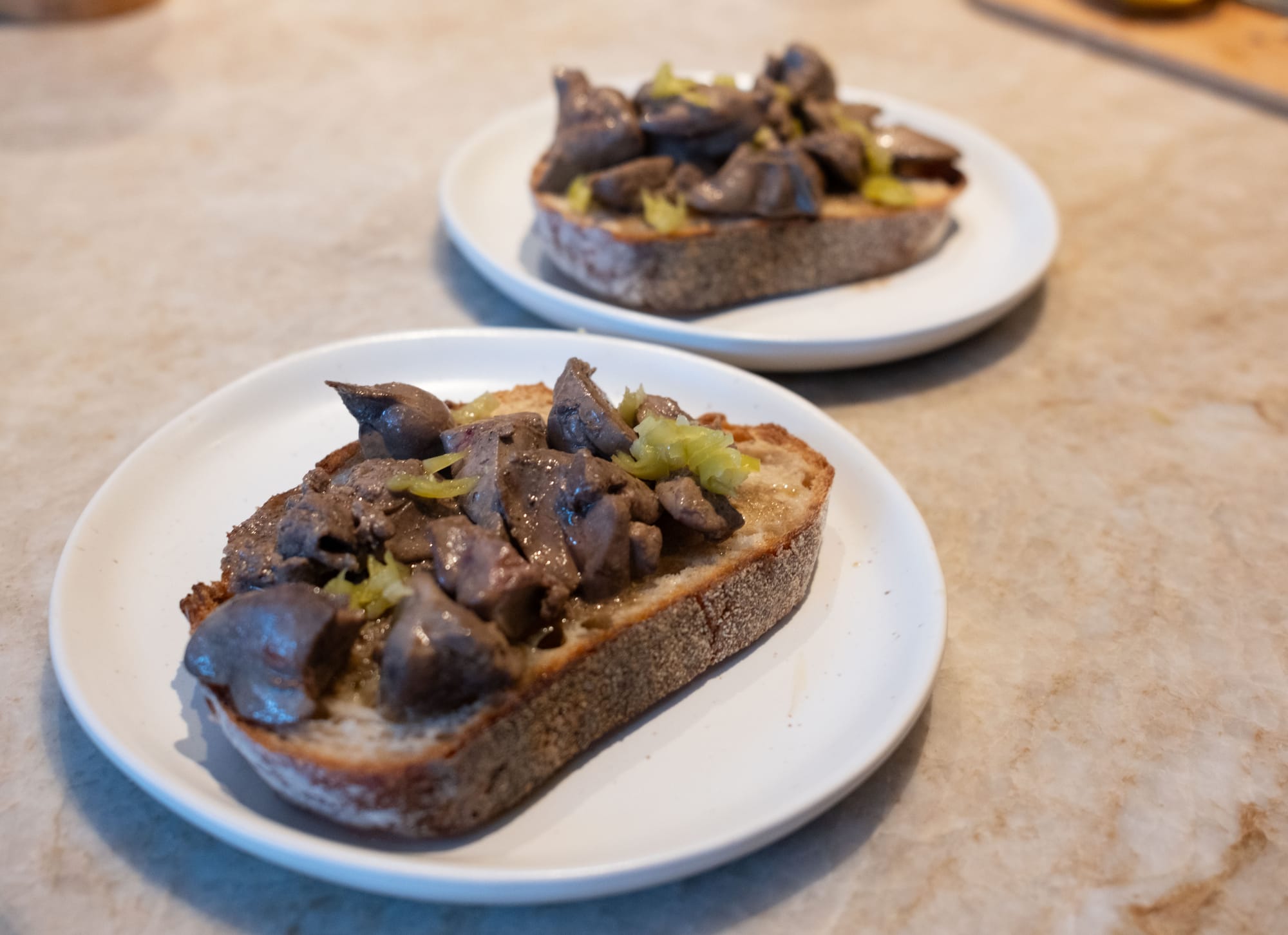 The need for an iron-rich diet saw the aperitif hour snack become a daily round of chicken livers on toast. As well as the iron, and keeping us from hunger for a few hours while we did bath time and attempted to get the baby asleep, the chicken livers played another role. We were blessed with a freezer full of food we’d laid in as preparation for these first weeks, and a steady supply of wonderful dishes from family and friends. For a few weeks, the daily chicken liver preparation was my only real moment of cooking. Ten minutes in the kitchen to carefully trim the livers of the membrane, cutting them into even sized pieces. A moment of calm focused for a moment just on a simple task: finely chopping a guindilla pepper, shaving strips of zest off a lemon. After a quick sear in olive oil, in goes salt, the day’s flavouring and then a final dash of something acidic. The guindilla pepper version gets a squeeze of lemon. Chilli crisp and a splash of black vinegar. Mustard and Worcestershire sauce for a devilled version. Yuzo kosho also works really well for both heat and citrus notes.