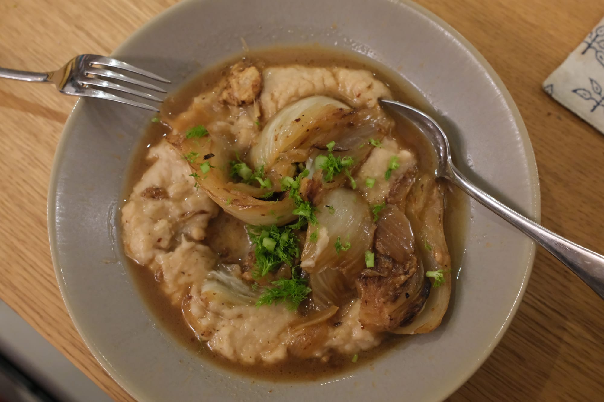 So far this hasn’t been a major issue as we’re in early stages of experimentation and as our appetite for carrot puree is limited, we are mostly cooking just for him. We saved a piece of frittata with spring greens and tried this. No egg reaction (big tick), but I think the grainy texture of cold frittata mixed with milk was – understandably – pretty unappetising for him. I did cook a batch of beans this week in just plain water and the difference in taste was clear. But that chunky puree of the beans has, alongside congee, been one of the biggest successes so far. Seeing him eating something I’d cooked – as simple as some beans crushed up in some milk – and come back for more is, for now at least, ample compensation for under-seasoned beans. Ours also got served with fennel braised in parmesan broth, so the flavour was pretty good for us in the end too.